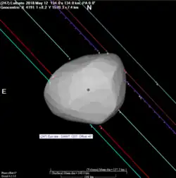 Die Auswertung einer Sternbedeckung durch (247) Eukrate am 12. Mai 2018. In die den Asteroidenschatten nachzeichnenden Beobachtungslücken ist ein Gestaltmodell eingepasst.
