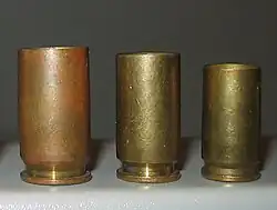 Patronenhülsen: links .45 ACP, Mitte .40 S&W, rechts 9-mm-Parabellum