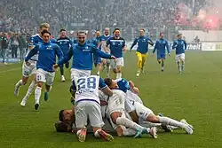 Die Saison 1973/74 gilt bis heute als die erfolgreichste der Vereinsgeschichte. Nachdem der 1. FC Magdeburg zur Winterpause mit drei Niederlagen auf dem zweiten Platz stand, blieb er in der Rückrunde unbesiegt. In der Schlussphase der Meisterschaft trafen an den letzten drei Spieltagen die direkten Konkurrenten Magdeburg, Jena und Dresden jeweils direkt aufeinander.[38][39] Die Mannschaft, die mit einem Durchschnittsalter von 22,3 Jahren die jüngste Meistermannschaft in der Geschichte der DDR-Oberliga war, musste ihre Duelle auswärts bestreiten und gewann beide Spiele mit 2:1 (Jena) und 1:0 (Dresden).[40] Nach dem Gewinn des zweiten Meistertitels stand am 8. Mai 1974 noch das Finale im Europapokals der Pokalsieger auf dem Programm. Auf dem Weg ins Endspiel schaltete der Club zunächst NAC Breda, Baník Ostrava, Beroe Stara Sagora und im Halbfinale den portugiesischen Meister Sporting Lissabon aus.[41][42] Im Finale im Rotterdamer De Kuip siegte der 1. FC Magdeburg, vor der für Endspiele ungewöhnlichen Minuskulisse von nur 4644 Zuschauern, gegen den von Trainer Giovanni Trapattoni betreuten Titelverteidiger AC Mailand, nach Toren von Enrico Lanzi (Eigentor) und Wolfgang Seguin mit 2:0.[43][44] Der Club wurde zum einzigen Fußballclub der DDR, dem es gelang, einen Europapokal zu gewinnen. Außerdem ist der FCM bis heute, zusammen mit den Lisbon Lions von Celtic Glasgow, der einzige Verein in der europäischen Fußballgeschichte, der den Pokal mit einer komplett lokalen Mannschaft erringen konnte. Dabei war die Tatsache, dass sämtliche Spieler ausschließlich aus dem Bezirk Magdeburg stammten, selbst für den DDR-Fußball ungewöhnlich. Der 1. FC Magdeburg ist bis heute neben dem FC Bayern München, Hamburger SV, Borussia Dortmund, Borussia Mönchengladbach, Eintracht Frankfurt, Bayer 04 Leverkusen, Werder Bremen und FC Schalke 04 einer von neun deutschen Clubs, die einen Europapokal gewinnen konnten (Stand Mai 2022).[45]