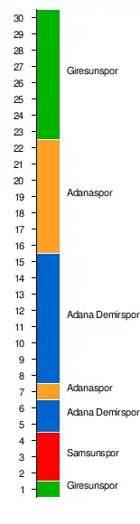 | 16. | Giresunspor | 30 | 3 | 10 | 17 | 18:38 | −20 | 16:44 |