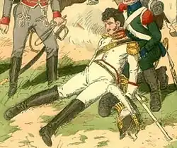 - Beim Vormarsch an der Weichsel August 1812 wurden die beiden westfälischen Kürassier-Regimenter unter Brigadegeneral von Lepel dem IV. Kavalleriekorps Latour-Maubourg einverleibt und wurden Teil der gemischten 7. schweren Kavalleriedivision[16] unter Divisionsgeneral Jean Thomas Lorge.