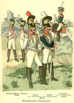 - Ab 1808 weißer Rock mit altrosa bzw. roter Abzeichenfarbe. Rosa Paspel an den Schoßtaschen. Silberne Knöpfe. Rosafarben waren auch Kragen, Ärmelaufschläge und Rabatten, jeweils mit weißer Paspel (n. Suhr). Rosa Schoßaufschläge ohne Paspel, mit weißer Granate im Winkel. Ungewiss ist, ob das Regiment um 1809 schon einen Kürass (Brustpanzer) trug. Offiziere hatten weiße, Mannschaften rote Fransenepauletten nach französischem Muster. Der Raupenhelm war aus Weißmetall mit schwarzer Pelzraupe und seehund/leoparden-brauner (n. Lienhardt) bzw. schwarzer (n. Knötel) Fellverbrämung (Turban). Helmkamm, Kinnriemen (Schuppenkette) und Schirmbeschlag waren aus Messing bzw. goldfarben. Auch befand sich am Helm ein goldfarbenes Stirnschild, das mit dem Kamm verbunden war und die Initialen „J. N“ für Jérôme Napoléon zwischen Lorbeerzweigen oder, beim 2. Kürassier-Regiment, die Regimentsnummer in einem Granatensymbol zeigte.[19] Ein roter oder weißer Federstutz wurde links am Helm eingesteckt.