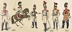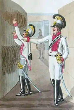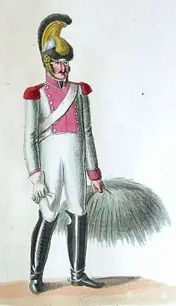 - Ab 1812 nachweislich mit stählernem Vollkürass (andersltd.: schwarzer Halbkürass nach preuß. Muster[20]). Ob nach 1812 der Stirnschild am Helm beibehalten wurde, ist strittig. Sehr wahrscheinlich jedoch ist die abgeänderte, geradere, nicht abgewinkelte Helmform vorne am Übergang zwischen Augenschirm und Fellverbrämung, die dem allgemeinen Erscheinungsbild der französischen schweren Kavallerie entsprach. Unter dem Brustpanzer trug das Regiment 1812 den einreihig geknöpften weißen Rock ohne Rabatten und Paspeln. Kragen, Knopfleiste, Schoß- und Ärmelaufschläge in altrosa bzw. roter Abzeichenfarbe. Möglicherweise wurde nach der Neuaufstellung des Regiments bis September 1813 eine kurzschößige weiße Uniform mit geraden Rabatten in Abzeichenfarbe, weißen Knöpfen, roten Epauletten, und ein bronzefarbener Raupenhelm mit schwarzer Fellverbrämung nach dem zeitgenössischen Vorbild der französischen Linien-Chevaulegers, ohne Kürass, getragen.