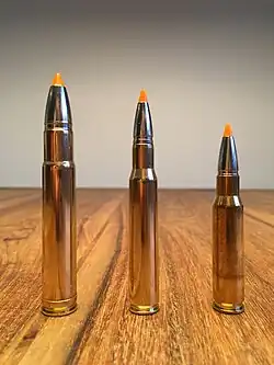 Um die Eignung auf verschiedene Wildarten zu ermöglichen, ist die Patrone mit Geschossgewichten zwischen 13 g und 26 g erhältlich.[8] Durch den großen Geschossquerschnitt soll bei der Bejagung auch von schwächerem Wild – wie beispielsweise Rehwild – die erhöhte Stoppwirkung Vorteile entfalten.