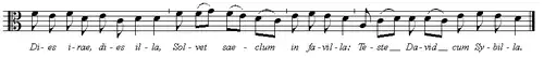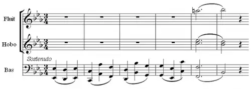 Adagio : (c-Moll), 3/4-Takt, Takt 1–39 Nach dem ganztaktigen Paukensolo setzt ein sechstaktiges, düster-getragenes Thema im Bass (Fagott, Cello, Kontrabass) ein, dessen Beginn an das „Dies irae“[5] erinnert und mit einer zweitaktigen Wendung aus zwei halben Noten abgeschlossen wird.