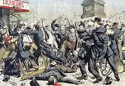 Eine prononcierte Rolle nahm das 11. Arrondissement während der Pariser Kommune 1871 ein.[9] Deren letzter Kriegsdeputierter, Charles Delescluze, fiel während der blutigen Maiwoche in der Nähe einer Barrikade auf dem Boulevard Voltaire. Bereits am Tag zuvor, am 24. Mai, hatte der Rat der Kommune sein Entscheidungszentrum in das 11. Arrondissement verlegt.[10] Das spektakulärste der Kommune zur Last gelegte Verbrechen, die im Zug der Stadtrückeroberung erfolgten Geiselerschießungen, dokumentierte durch seinen improvisierten Ablauf die Erbitterung der Kämpfe. Die Exekution des Pariser Erzbischofs sowie rund 70 weiterer Geiseln in der Grande Roquette sowie der Rue Haxo geriet zu einer dezentralen, improvisiert verlaufenden Abfolge von Erschießungen. Maßgebliche Akteure dabei: Nationalgarde-Verbände, die während des Rückzugs vor den vorrückenden Regierungstruppen stark dezimiert worden waren.[11]