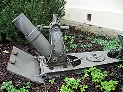 Die Oberlafette war mit der Unterlafette bajonettartig verbunden, wodurch ein seitliches Richten von bis zu 10° in beide Richtungen möglich war. Alles darüber hinaus musste durch das Verschieben des gesamten Minenwerfers vollzogen werden. Das System verfügte über kein Rückstoßgewinnungssystem. Transportiert wurde er auf Zweiradkarren.[1][2]