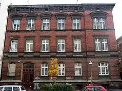 Das dreigeschossige Lehrerwohnhaus findet sich links neben dem Hofzugang und ist mit rotem Ziegelstein verblendet und durch Elemente aus graugelbem Sandstein gegliedert. Das Gebäude auf einer bebauten Fläche von 317 m² besitzt eine 18,5 m lange, asymmetrische Fassade mit flacher Eckvorlage rechts und Hauseingang links. Die horizontale Gliederung erfolgt durch ein schweres Konsolgesims, Terrakotta-Zierstreifen und Stichbogenfenster im Erdgeschoss und durch Rechteckfenster mit ausgeprägten Gewänden und schwerer Verdachung in den beiden Obergeschossen.