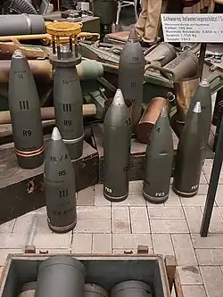 Für das sIG 33 gab es 38 kg schwere Sprenggranaten, 24,6 kg schwere HL-Granaten und Rauchgranaten. Die Lebensdauer eines Rohres betrug ungefähr 10.000 bis 15.000 Schuss.[6]