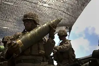- Das XM1113, ein hochexplosives Geschoss gefüllt mit insensitivem Sprengstoff mit einem Raketenmotor und dadurch gesteigerte Reichweite von mehr als 40 km mit einem Geschütz von 39 Kaliberlängen und über 60 km bei 58 Kaliberlängen.[13]