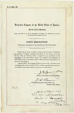 Der 16. Zusatzartikel zur Verfassung der Vereinigten Staaten von Amerika, der die Erhebung von Einkommensteuern in ihrer momentanen Form gestattet, wurde am 12. Juli 1909 verabschiedet und am 3. Februar 1913 ratifiziert.[1][2]