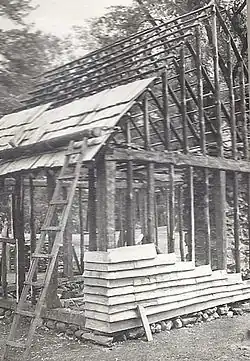 Das tragende Balken-, Sparren- und Pfostengerüst kurz nach dem Beginn der Verkleidung mit Schindeln