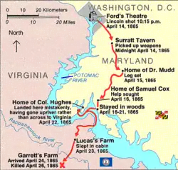 - 23. April: John Wilkes Booth und seinem Komplizen David Herold gelingt es mit einem Boot, den Potomac River nach Virginia zu überqueren, wo sie sich Unterstützung von der Konföderation erhoffen.