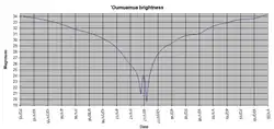 - Für den Fall, dass ‘Oumuamua um seine längste Achse rotiert (eine Rotation um die mittlere Achse wäre instabil), könnte er bei einer Dichte von mehr als 1500 kg/m³ nur durch seine eigene Gravitation zusammengehalten werden. Für eine Albedo von 0,04 ergeben sich damit Abmessungen von etwa 360 m × 180 m × 18 m, bei einem Wert von 0,2 wären es 160 m × 80 m × 8 m.[1]