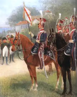 Zwischen den Franzosen und den Alliierten wurde bald darauf Frieden geschlossen. Die Polen wurden in Dresden stationiert. In der kurzen Friedenszeit konnten sie sich erholen, waren aber auch bei der Bekämpfung von Partisanen eingesetzt. Im Juni 1813 wurde eine siebte Escadron aufgestellt, was das Regiment auf eine Personalstärke von 1750 Reitern brachte.[39] Das Regiment wurde in drei Gruppen aufgeteilt: die ersten drei Escadrons gehörten zur Alten Garde, die vierte und fünfte und die sechste Escadron zur Mittleren Garde, die siebte Escadron zur Jungen Garde.