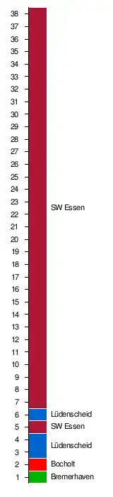 | 2. | Rot-Weiss Essen | 2:0 | 4:4 | 2:1 | 3:1 | 1:1 | 1:0 | 3:2 | 2:0 | 4:3 | 6:0 | 1:2 | 3:1 | 3:1 | 4:0 | 4:1 | 2:0 | 4:1 | 6:1 | 4:0 | |
