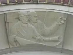 Das Gebäude fällt auf durch eine Reihe von steinernen Reliefs in den Architraven der Rundbogenfenster des Erdgeschosses. Sie bilden das Bauhandwerksgeschäft ab und stellen drei Arbeiter dar, die Bautätigkeiten ausüben.[6][15] Im Bereich des linken Fensters ist die Darstellung Denmans mit Hut zu sehen, der einen Architekturplan hält und mit einem anderen Mann spricht. Die anderen Reliefs zeigen einen Mann, der Backsteine verlegt, und einen anderen Mann, der ein Holzstück zersägt.[6][15] Der ausführende Bildhauer war Joseph Cribb, der lange Jahre mit Denman zusammenarbeitete, etwa bei den Büros der Zeitung Brighton & Hove Herald in den Pavilion Buildings, die nur eine geringe Strecke entfernt liegen.[2][6] Diese Reliefs sind in einem guten Zustand und unterliegen nicht der unmittelbaren Gefahr der Verwitterung.[15]