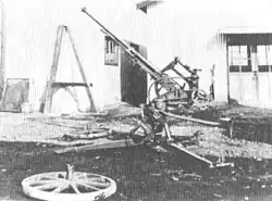 Die drei Holme waren in Feuerstellung in einem Winkel von jeweils 120° zueinander angeordneten. Sie bestanden jeweils aus vier in einer Dreiecksform verschweißten Stahlrohren. Alle drei waren nach außen abfallend an der Unterlafette montiert und hatten einen Auflageteller, auf dem sie auf dem Untergrund standen. Der vordere Holm war jedoch etwas kürzer ausgelegt. Beim Stellungswechsel musste das 376,7 kg schwere Geschütz zunächst angehoben werden, um die Räder auf die Achse zu stecken. Auf kurzen Strecken konnte es dann mit Zugstangen an den teilweise zusammengeklappten, hinteren Holmen im Mannschaftszug bewegt werden. Bei größeren Entfernungen wurde zudem der vordere Holm demontiert und auf den zusammengeklappten, hinteren Holmen, die auch als starre Deichsel dienten, befestigt. Das Geschütz konnte dann an der Protze eingehängt werden. So war ein Transport mit Zugtieren möglich. Für den motorisierten Transport musste die leicht gebaute Waffe im Transportzustand auf einen Spezialanhänger verladen werden. Die Bedienmannschaft bestand aus 5 Mann: Geschützführer, Richtschütze, Ladeschütze, 2 Munitionskanoniere. Die Magazine wurden neben dem Geschütz bereit gelegt und in Feuerpausen von der Mannschaft neu befüllt. Die Munition wurde vom Munitionszug, nach Art sortiert und lose in hölzernen Kisten verpackt, nachgeführt.