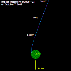 Der sehr kleine Asteroid wurde am 6. Oktober 2008 nur gut 20 Stunden vor seinem Zusammenprall mit der Erde von Richard A. Kowalski entdeckt (Catalina Sky Survey), als er sich noch außerhalb der Mondbahn befand.[1] Nach der ersten Meldung kam es zu einer Vielzahl an astronomischen Beobachtungen weltweit; diese waren bis zum Eintritt in den Erdschatten am 7. Oktober um 03:49 MESZ möglich. Aus den dabei festgestellten periodischen Helligkeitsschwankungen wurde geschlossen, dass 2008 TC3 außergewöhnlich schnell rotierte.[2] Die taumelnden Drehungen um zwei Achsen zeigten Perioden von 99,173 und 96,988 Sekunden.[3] Aus über 500 astrometrischen Messungen ließ sich der genaue Kollisionskurs berechnen.[4] Die Bahndaten des etwa 4 m großen und 80 t schweren Asteroiden zeigten, dass er am 7. Oktober 2008 um 04:46 MESZ über dem Norden des Sudan, in der Nubischen Wüste östlich des Nil, abstürzen würde.[5] Aufgrund der Bahngeometrie des Asteroiden errechnete sich der Eintritt in die Lufthülle der Erde mit einer geringen Relativgeschwindigkeit von 12,8 km/s.[6] Der Eintrittswinkel, bezogen auf die Horizontale, wurde mit etwa 19° berechnet. Wegen der geringen Größe des Himmelskörpers waren auf der Erde keine bedeutenden Schäden zu erwarten.