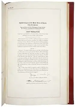 Der 22. Zusatzartikel zur Verfassung der Vereinigten Staaten begrenzt die Amtszeit des Präsidenten auf maximal zwei Amtsperioden.[1] Der Kongress brachte den Zusatz am 21. März 1947 ein, am 27. Februar 1951 trat er in Kraft. Vor dem Inkrafttreten des Zusatzartikels war eine Wiederwahl mehr als ein Mal möglich. Nur Franklin D. Roosevelt wurde zu mehr als zwei Amtszeiten gewählt. Seine Wahl für eine vierte Amtszeit im November 1944 war der Auslöser, eine Amtszeitbegrenzung in der Verfassung zu verankern.[2]