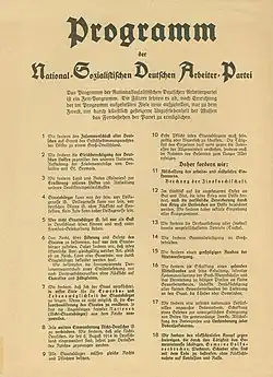 Das 25-Punkte-Programm war das Parteiprogramm der Nationalsozialistischen Deutschen Arbeiterpartei. Adolf Hitler verkündete es am 24. Februar 1920 vor etwa 2000 Personen im Münchner Hofbräuhaus. Am selben Tag wurde die bereits am 20. Februar vollzogene Umbenennung der 1919 gegründeten Deutschen Arbeiterpartei (DAP) in „Nationalsozialistische Deutsche Arbeiterpartei“ (NSDAP) veröffentlicht.
