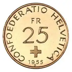 | 25 Fr. | 90 % Au, 10 % Cu | 5,645 g | 20 mm | 1,33 mm |