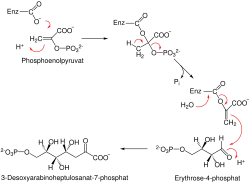 Erythrose-4-phosphat und Phosphoenolpyruvat werden mit Wasser zu 3-Desoxyarabinoheptulosanat-7-phosphat und Phosphat umgesetzt.