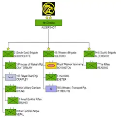 Im Jahr 1995 wurde die 4th Division (UK) zu einer regenerativen Division, welche die drei regionalen Brigaden 2nd (South East) Brigade, 43rd (Wessex) Brigade und 145th (South) Brigade befehligte. Aus organisatorischen Gründen waren ihr ebenso die British Gurkhas Nepal und die British Garrison in Brunei unterstellt.