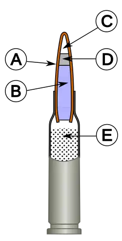 A: Mantel, B: Stahlkern, C: Hohlspitze, D: Bleieinlage, E: Treibladung