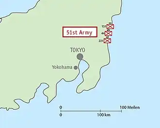 Nachdem die Alliierten am 19. Februar 1945 auf der ca. 1000 km vom japanischen Festland gelegenen Insel von Iwojima gelandet waren traf das Daihon’ei (Japanisches Hauptquartier) eiligst Vorbereitungen für die bevorstehende Landung der US Army, die von diesen Operation Downfall genannt wurde. Zu diesem Zweck wurden allein im Jahr 1945 mehrere Armeen mit über 80 Divisionen neu ausgehoben. Am 8. April 1945 wurde die 51. Armee unter dem Kommando von Generalleutnant Noda Kengo aufgestellt und der 12. Regionalarmee unterstellt. Hauptquartier der 51. Armee war Tsuchiura in der Nähe Präfektur Ibaraki.[1] Sie bestand aus der 84., 151. und 221. Division.[2] Des Weiteren unterstanden der Armee die 115. und 116. Selbstständige Gemischte Brigade, die 7. Selbstständige Panzer-Brigade sowie das 9. Artillerie-Regiment. Bei den Infanterie-Einheiten handelte es sich um kurz zuvor aufgestellte Divisionen aus eiligst ausgehobenen Rekruten, unter ihnen viele Studenten. Aus Mangel an Gewehren wurden viele der Rekruten mit Bambusspeeren ausgerüstet.