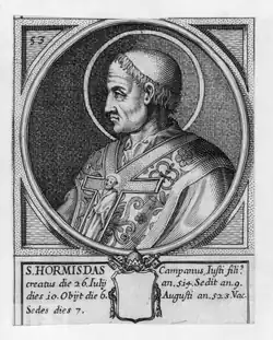 Auf den am 19. Juli verstorbenen Symmachus folgt schon am nächsten Tag sein Archidiakon Hormisdas als Bischof von Rom. Eine der ersten Sorgen des neuen Papstes ist es, die letzten Spuren des Laurentianischen Schismas aus Rom zu tilgen und die übrig gebliebenen Abtrünnigen in die Kirche zurückzuführen. Der größte Teil seines Pontifikats beschäftigt sich danach mit der Heilung des Akakianischen Schismas, des seit 484 bestehenden ersten grundsätzlichen Schismas zwischen östlicher und westlicher Christenheit, das auf der Exkommunikation des 489 verstorbenen Akakios von Konstantinopel unter Vorwurf des Nestorianismus gründet.