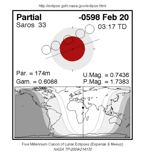 - Im fünften Regierungsjahr des babylonischen Königs Nebukadnezar II. wird die Mondfinsternis vom 19./20. Februar 599 v. Chr. keilschriftlich festgehalten.