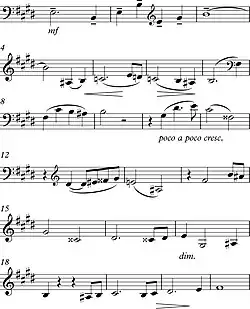 Auf einen Quartschritt abwärts folgt ein aufsteigender gebrochener E-Dur-Akkord, majestätisch in gewichtig gleichmäßigen Schritten,[13] der länger gehaltene Spitzenton suggeriert einen „weitdimensionierte[n] Raum“.[14] Auf die großen Intervalle folgen dann zwei kleine Sekundschritte, die das „mediantisch bzw. neapolitanisch leuchtende C-Dur der Takte 7/8 herbeiführen“. Quartschritte und harmonische Wechsel erwirkende unerwartete kleine Sekundschritte begegnen auch in späteren Teilen der Komposition, auch die Tonart C-Dur wird in Folge bedeutend.[15] Eine erste Zäsur tritt in der zweiten Hälfte des neunten Melodietaktes auf, mit den folgenden Taktgruppen ergibt sich das Bild einer für Bruckner untypischen asymmetrischen Gliederung. Berücksichtigt man jedoch die Harmonik und ein „Schwer-leicht-Pendel der Takte“, so passt sich die mit Auftakten aufzufassende Melodik in ein „geradzahliges metrisches Gerüst“ ein.[16] Die Ausbreitung der Melodie über zwei Register erinnert an das Konzept der „Mehrstimmigkeit in der Einstimmigkeit“ als wesentliches Prinzip der Instrumentalmusik des 19. Jahrhunderts.[17]