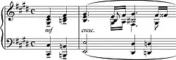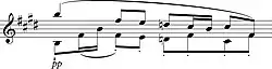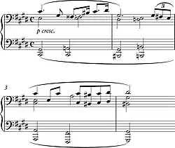 Im „Augenblick der Auflösung der Dissonanz“ setzt das dritte Thema ein, „pianissimo in plötzlicher Ruhe“, jedoch erstmals mit ausgeprägtem Rhythmus, der bis zum Schluss der Exposition durchgehalten wird,[28] es bildet somit das Ziel einer Anlage mit einer „ausgeklügelten Dosierung der zunehmenden rhythmischen Spannung, welche die drei Themen durchdringt“.[29] Es besteht aus zwei „Unisono-Klangflächen“ übereinander: eine eintaktige absteigende Figur der Holzbläser und eine ebenso lange Phrase der Streicher, beides mehrfach aneinandergereiht, was nicht im Einklang mit der klassisch-romantischen Ästhetik stand[30] und hier trotz der motivischen Lebendigkeit eine „ganz eigentümliche Starrheit“ hervorruft, die Passage wirkt „schattenhaft, dämonisch“[25] mit „huschende[n] Gestalten im unisonen Streicherapparat“.[22]