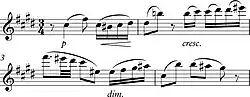 Das etwas langsamere Trio bietet ein „idyllische[s] Intermezz[o]“,[104] im Charakter wie überirdisch entrückt und unwiederbringlich.[105] Ein „schwebendes Thema“[106] in F-Dur verbreitet „sanfte Poesie, ein schubert-nahes inniges Melos“[107] und kontrastiert zum Scherzo, aus dem das rhythmische Motiv jedoch für Übergänge genutzt wird.[72] In der farbigen Harmonik kommen mediantische Verbindungen zur Geltung, der Rhythmus „erfährt durch duolische Einschübe eine behutsame Nuancierung“.[108]