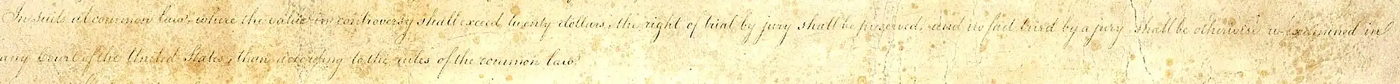 „In Zivilprozessen [zum Common Law], in denen der Streitwert zwanzig Dollar übersteigt, besteht ein Anrecht auf ein Verfahren vor einem Geschworenengericht, und keine Tatsache, über die von einem derartigen Gericht befunden wurde, darf von einem Gerichtshof der Vereinigten Staaten nach anderen Regeln als denen des gemeinen Rechts erneut einer Prüfung unterzogen werden.“