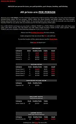 - ↑ a b c d e Kabinenpreise des 70000 Tons of Metal 2012 ( vom 18. Mai 2011 im Internet Archive), 70000tons.com, abgerufen am 1. März 2012 (englisch)