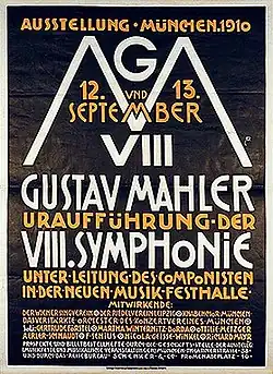 Die Uraufführung des bereits 1907 fertiggestellten Werkes fand erst am 12. September 1910 in München statt. Grund hierfür waren unzählige organisatorische Probleme.[6] Das Konzert fand in der Neuen Musik-Festhalle, der heutigen Halle 1 des Verkehrszentrums des Deutschen Museums in München statt. Mahler dirigierte das Orchester des Konzertvereins München, die heutigen Münchner Philharmoniker, selbst. Der Leipziger Großchor Riedel-Verein, der Wiener Singverein und 350 Schüler der Münchner „Zentral-Singschule“ als Kinderchor steuerten die vokalen Elemente der Aufführung bei. Der bedeutende Dirigent Otto Klemperer assistierte Mahler bei den letzten Vorbereitungen der Aufführung zusammen mit Bruno Walter. Walter selbst wählte die acht Gesangssolisten aus, die zunächst jeweils in den Heimatstädten probten, bevor sie Anfang September nach München zu den Hauptproben unter Mahlers Leitung zusammenkamen.[2]