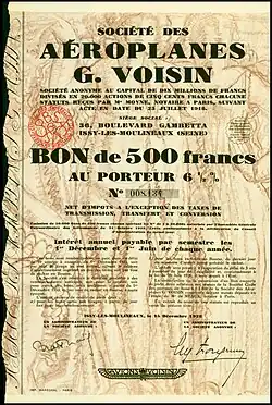 Im Ersten Weltkrieg war die Firma ein wichtiger Hersteller von Militärflugzeugen, insbesondere wurde die Voisin III produziert. So war Gabriel Voisin – sein Bruder kam bei einem Verkehrsunfall im Jahre 1912 ums Leben – bei Kriegsende recht wohlhabend. Er wandte sich nach Kriegsende vom Flugzeugbau ab und arbeitete mit dem befreundeten Automobilkonstrukteur André Citroën zusammen, um in der Firma Voisin ein von Citroën-Ingenieuren entwickeltes Luxusauto zu bauen.