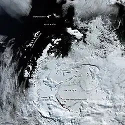 Am 16. September 2017 zeigten Satellitenbilder der Europäischen Weltraumorganisation (ESA) zwischen dem Eisberg A-68a und dem Larsen-C-Schelfeis eine Lücke. Sie betrug im Süden der längsten Bruchlinie an der Stelle der größten Entfernung etwa 18 Kilometer.[8] Bis Anfang Juli 2018 hatte sich das Hauptstück, der Eisberg A-68a, bis etwa 50 Kilometer von der Bruchstelle entfernt.[9] In den darauffolgenden zwei Monaten vollzog er eine Drehung und ragte Anfang September rechtwinklig zur Schelfeiskante ins Weddellmeer.[10]