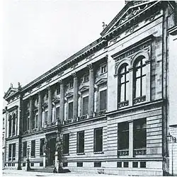 Das Haus zeigte „eindeutig palastartige Grundzüge“, wies aber auch eine „beträchtliche Ausdehnung des Geschäftsbereiches innerhalb des Gebäudes“ auf. Die Fassade des dreigeschossigen Baus war in neun Achsen eingeteilt, wovon Seitenrisalite jeweils eine Achse beanspruchten. Die Mittelachse zeigte bis zum Umbau 1902 ein von Karyatiden flankiertes Portal. Nach dem Umbau hatte das Gebäude zwei Eingänge, in jedem Seitenrisalit jeweils einen, der von Karyatiden flankiert war. Darüber befand sich ein Balkon. Der frühere Haupteingang in der Mitte wurde zugemauert.