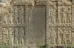 Die Inschrift wurde erstmals in einer Zeichnung von Eugène Flandin und Pascal Coste 1851–1854 veröffentlicht. Der deutsch-französische Altorientalist Jules Oppert übersetzte die Inschrift 1852 in die französische, der amerikanische Theologe und Altphilologe Herbert Cushing Tolman 1908 in die englische und Franz Heinrich Weißbach 1911 in die deutsche Sprache.
