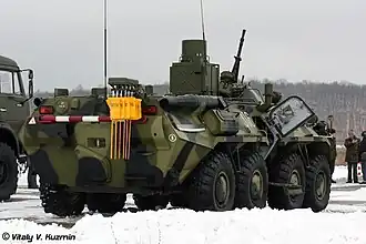 • Gepanzerter Mannschaftstransportwagen BTR-82A mit Soldaten in ABC-Anzügen