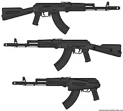 Unterschiede zum AKM sind ein 90-Grad-Gasblock im AK-74-Stil und ein Handschutz vom Typ AK-74, der aus schwarzem Kunststoff besteht und mit einem Hitzeschild ausgestattet ist.