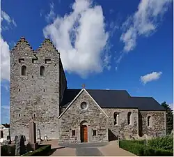 Die Kirche wurde in romanischer Waldemarszeit in der zweiten Hälfte des 12. Jahrhunderts in mehreren Bauphasen aus Grünsandstein und Silurkalk im romanischen Stil erbaut; am ältesten sind Chor und Apsis, am jüngsten das Waffenhaus (ca. 1200–1225),[3] eine der wenigen romanischen Vorhallen in Dänemark. Der Kirchturm hat zwei querstehende Satteldächer mit kleinen Staffelgiebeln.