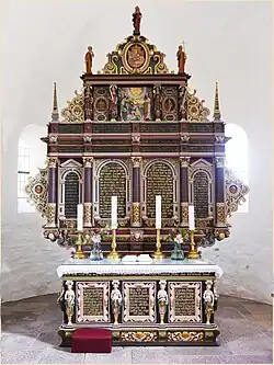 Der Altar mit der Jahreszahl 1608 stammt ebenfalls aus der Werkstatt von Jacob Kremberg. Das Altarretabel zeigt im Hauptfeld ein Kruzifix, flankiert von korinthischen Säulen und Arkadenfeldern mit goldener Schrift, welche die Einsetzungsworte des Abendmahls auf Dänisch und Joh 6 und 1 Joh 1,7 auf Lateinisch zitieren. Das darüber befindliche Feld zeigt mittig ein Relief der Taufe Christi; seitlich sind vier Hermen zu sehen, welche Klugheit, Stärke, Gerechtigkeit und Mäßigung symbolisieren. Das Oberstück des Altars zeigt in einer Kartusche das dänische Reichswappen.[5]