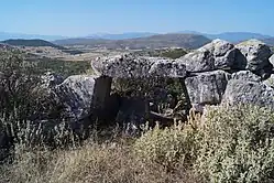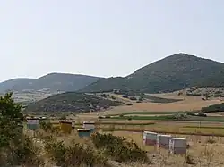 Etwa 700 Meter südwestlich fand man auf einem niedrigen Hügel ein Heiligtum aus dem 4. Jahrhundert v. Chr. mit einer etwa 30 Meter langen Stoa und zwei kleinen Tempeln. Leake und Yorke vermuteten, dass es sich hierbei um das berühmte Apollon-Heiligtum von Abai handeln würde. In der Nekropole am Berghang westlich des Heiligtums wurden seltene bronzene Gegenstände aus hellenistisch-römischer Zeit gefunden, des Weiteren importierte korinthische und attische Keramik sowie Terrakotta.[15]