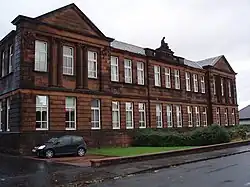 Das Gebäude liegt im Stadtzentrum an der Carronflats Road. Das mit klassizistischen Details gestaltete, zweistöckige Gebäude wurde im Jahre 1908 errichtet. Das Mauerwerk besteht aus rotem Sandstein, der zu Quadern behauen wurde. Die südexponierte Vorderfront ist symmetrisch in fünf Segmente mit jeweils drei Fensterachsen unterteilt. Die äußeren sowie der mittlere Block springen leicht hervor. Dreiecksgiebel bekrönen die beiden äußeren Segmente, die im Obergeschoss mit jeweils zwei ionischen Säulenpaaren gestaltet sind. An den Ost- und Westseiten sind die Fenster auf sieben vertikalen Achsen im Schema 3–1–3 angeordnet. Ebenerdig ist mittig an jeder Seite jeweils eine Eingangstür für die geschlechtergetrennte Schule zu finden. Gesprengte Segmentgiebel bekrönen die Portale.[1]