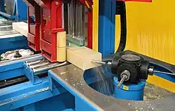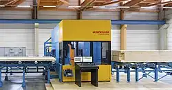 Das Werkstück wird dann in der Regel dem jeweiligen Aggregat (sägen, fräsen, markieren, …) zugeführt und bearbeitet. Der Transport der Bauteile bzw. Werkstücke erfolgt über verschiedene Transportsysteme wie z. B. Greif- und Führungswagen. Mit diesen kann auch bei verdrehten oder krummen Hölzern die notwendige Genauigkeit der Bearbeitung erzielt werden.
