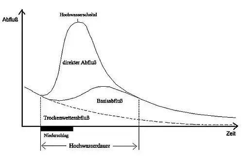 - Als Basisabfluss (engl. Base Flow) werden die Teile des Wassers bezeichnet, die den Vorfluter erst mit erheblicher Verzögerung erreichen. Er setzt sich zusammen aus: